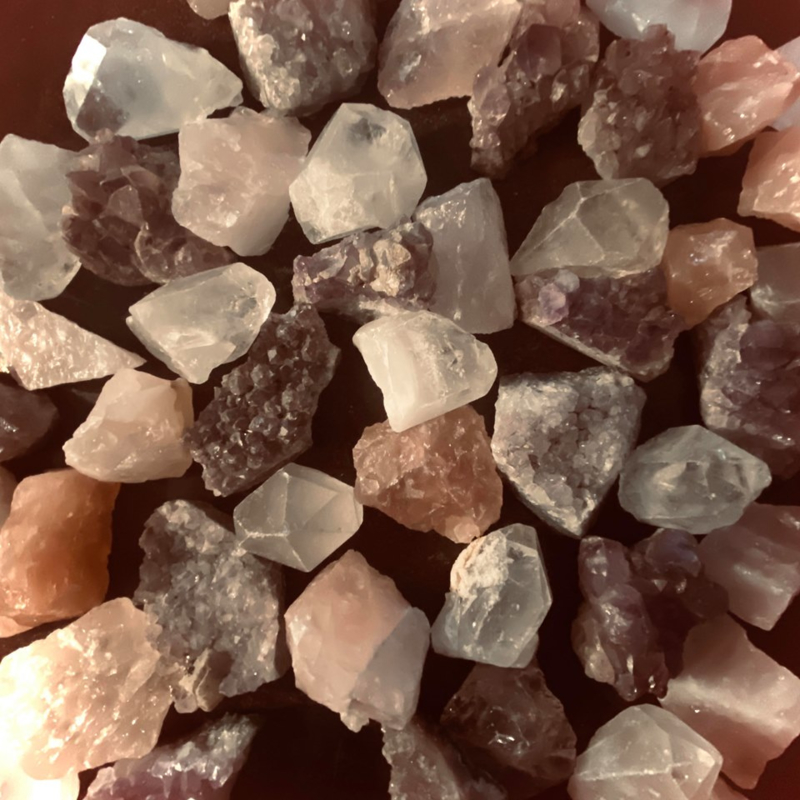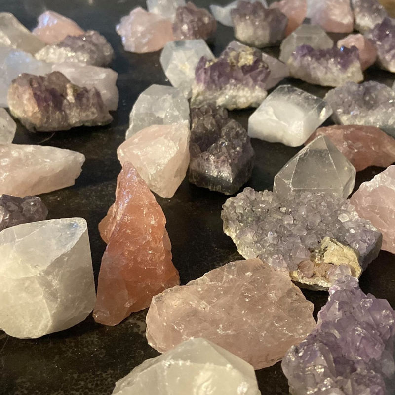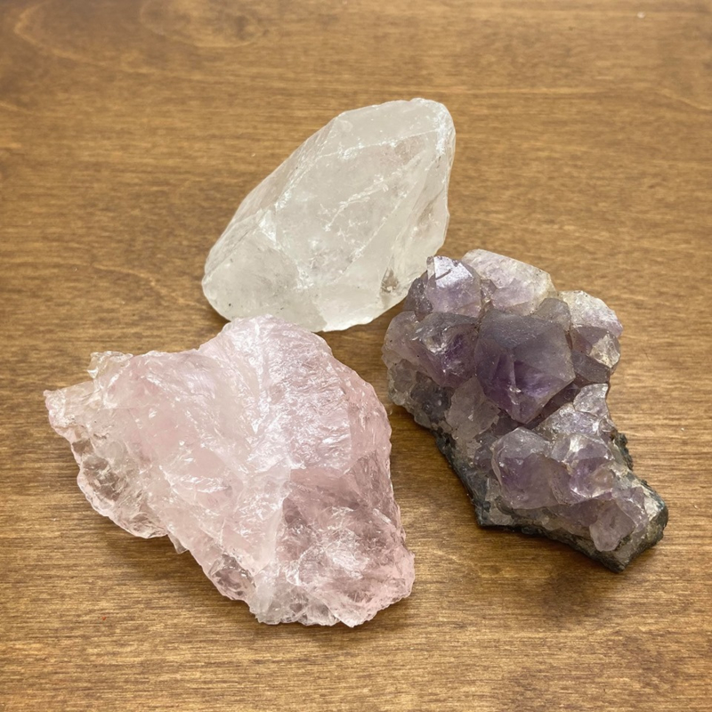 Set bestaat uit 1 Bergkristal punt, 1 Amethist geode stuk en 1 stukje ruwe Rozenkwarts